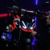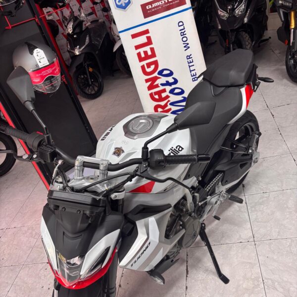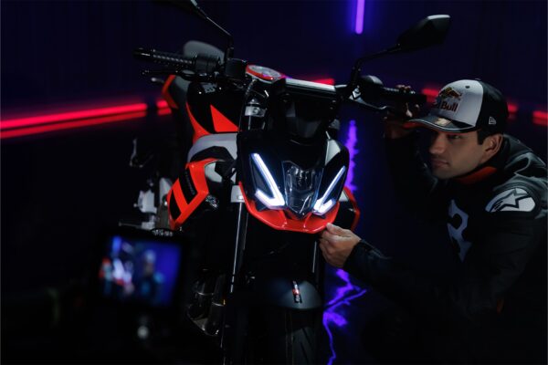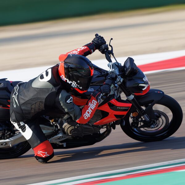 Aprilia Tuono 457 si spoglia della carena per rivelare l’essenza del dinamismo su ruote: look aggressivo e minimale, posizione di guida eretta e il miglior rapporto peso/potenza della categoria. Agile, potente e tecnologica come ogni Aprilia Tuono, grazie al motore bicilindrico, al telaio in alluminio e al sistema elettronico avanzato con Ride by Wire, Traction Control e tre Riding Mode. Il design di Aprilia Tuono 457 si distingue per le sue linee compatte ed essenziali che catturano l’anima sportiva di una vera naked. Il triplo faro anteriore full LED richiama l’iconico stile di Aprilia mentre il piccolo spoiler rende omaggio alla leggendaria Tuono 1000 R. Ogni dettaglio è il risultato di un design funzionale votato alla sportività: l’ottima ergonomia del serbatoio si abbina all’ampio manubrio e alla sella bassa ma rastremata ai lati, per un’esperienza di guida confortevole ma sempre dinamica. Aprilia Tuono 457 è spinta da un moderno motore bicilindrico di 457 cc con funzione portante, un vero gioiello di tecnologia firmato Aprilia, volutamente lasciato scoperto. Il modernissimo propulsore raffreddato a liquido eroga una potenza massima di 35 kW (47,6 CV) a 9.400 giri/minuto: il massimo possibile per una moto guidabile con patente A2. Aprilia Tuono 457 è l’unica del suo segmento a vantare un telaio in alluminio, scelta obbligata per garantire l’eccellenza nel comportamento dinamico. Progettato attraverso avanzate tecnologie di Computer Aided Engineering (CAE) e approfonditi test su strada, contribuisce a ottenere un peso a secco di soli 159 kg, per un rapporto peso/potenza da record. Il reparto sospensioni è di alto livello: il precarico è regolabile sia sulla forcella con steli da 41 mm che sull’ammortizzatore posteriore che lavora sul forcellone asimmetrico in acciaio.